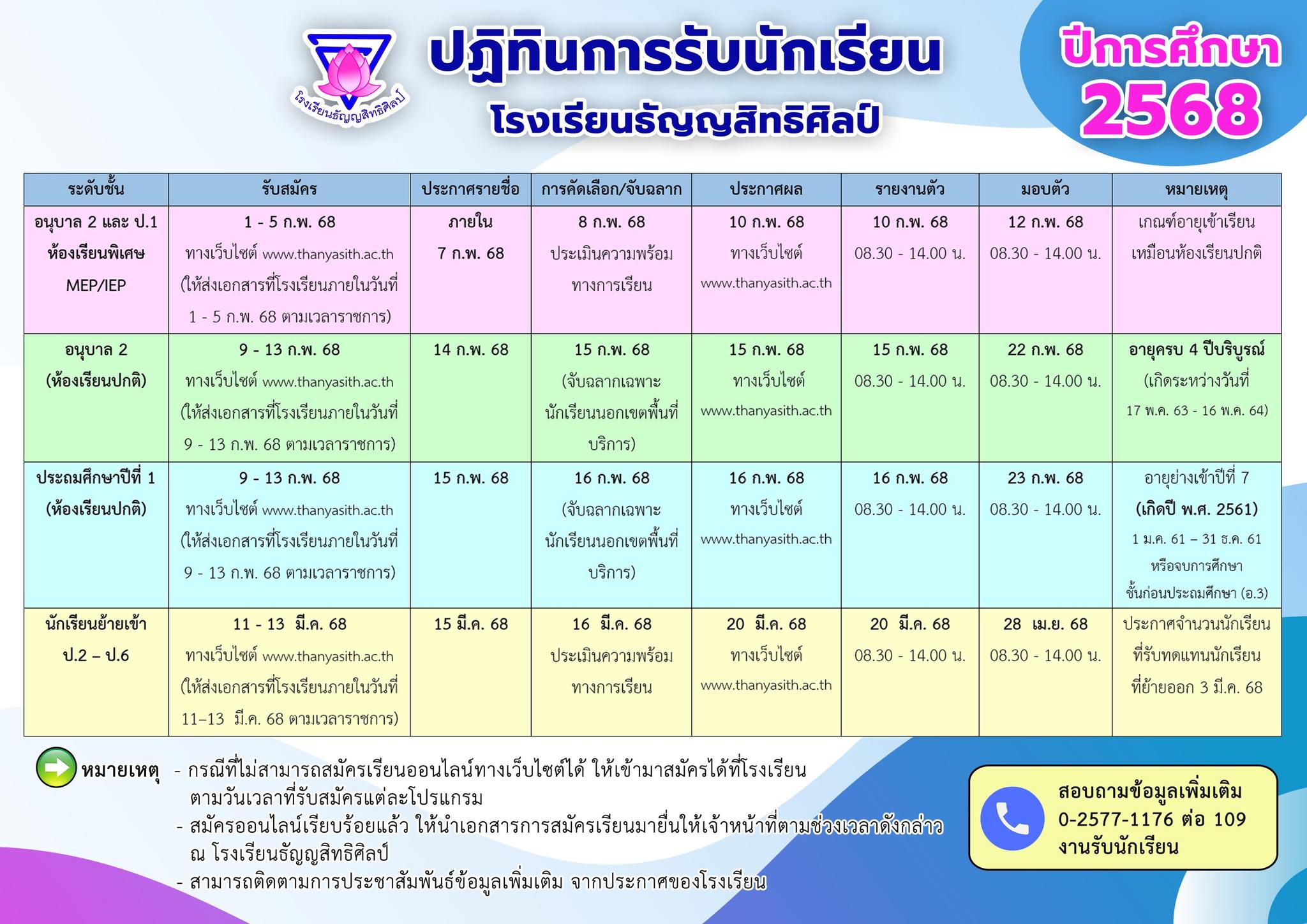 ตารางการรับนักเรียนใหม่ 2568
