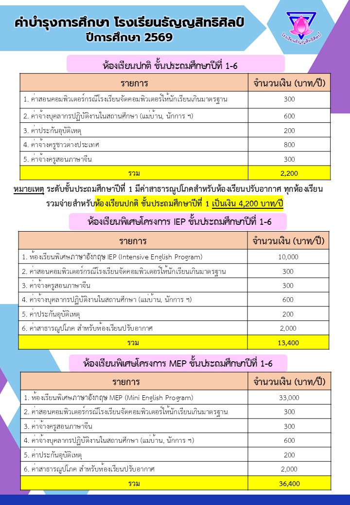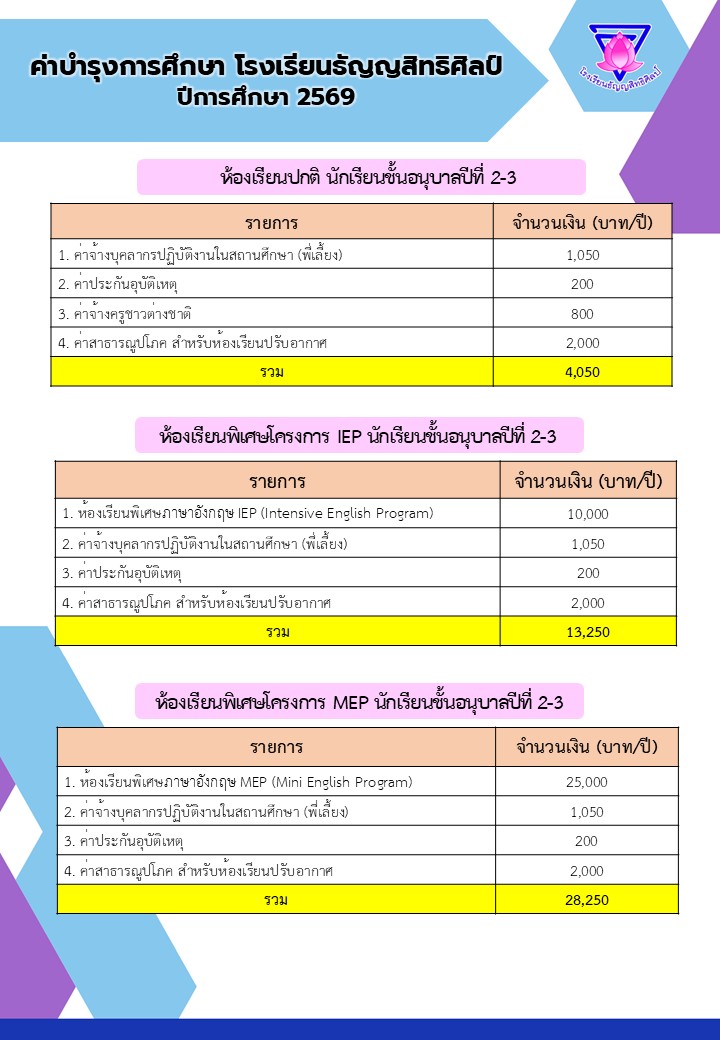 ค่าบำรุงการศึกษา ระดับชั้นอนุบาล